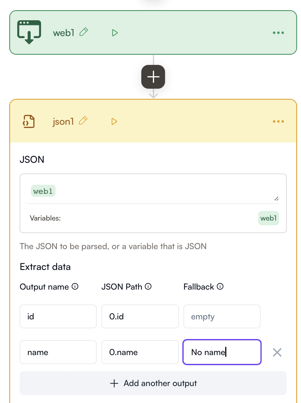 In another block, you can see the variables being available as `{json1.id}` and `{json1.name}`.